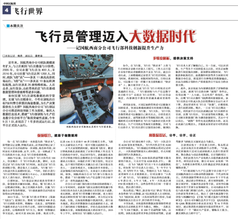 《中国民航报》2016年9月19日以“飞行员管理迈入大数据时代—记国航西南分公司飞行部科技创新提升生产力”为题对此进行了专版介绍,《中国航空》和《国航西南讯息》随后头版转载。